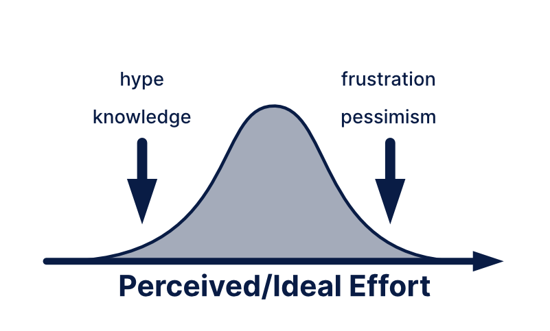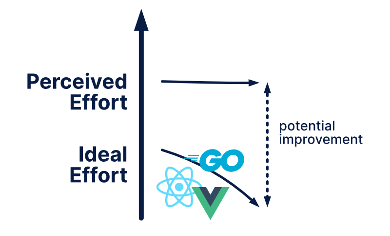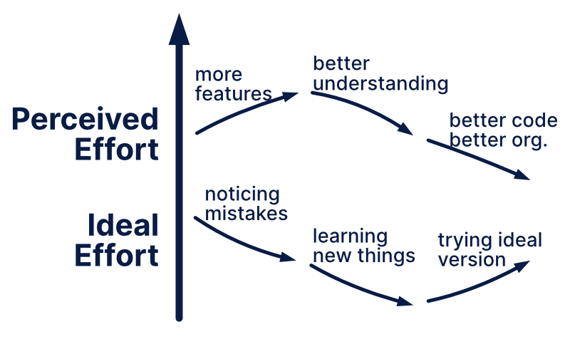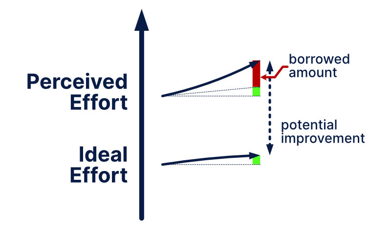Borrowing technical debt is also nicely explained with this way of thinking. Instead of perceived effort and ideal effort changing separately, they are changed together. Or in other words, we increase perceived effort while knowing that ideal effort would increase it less.